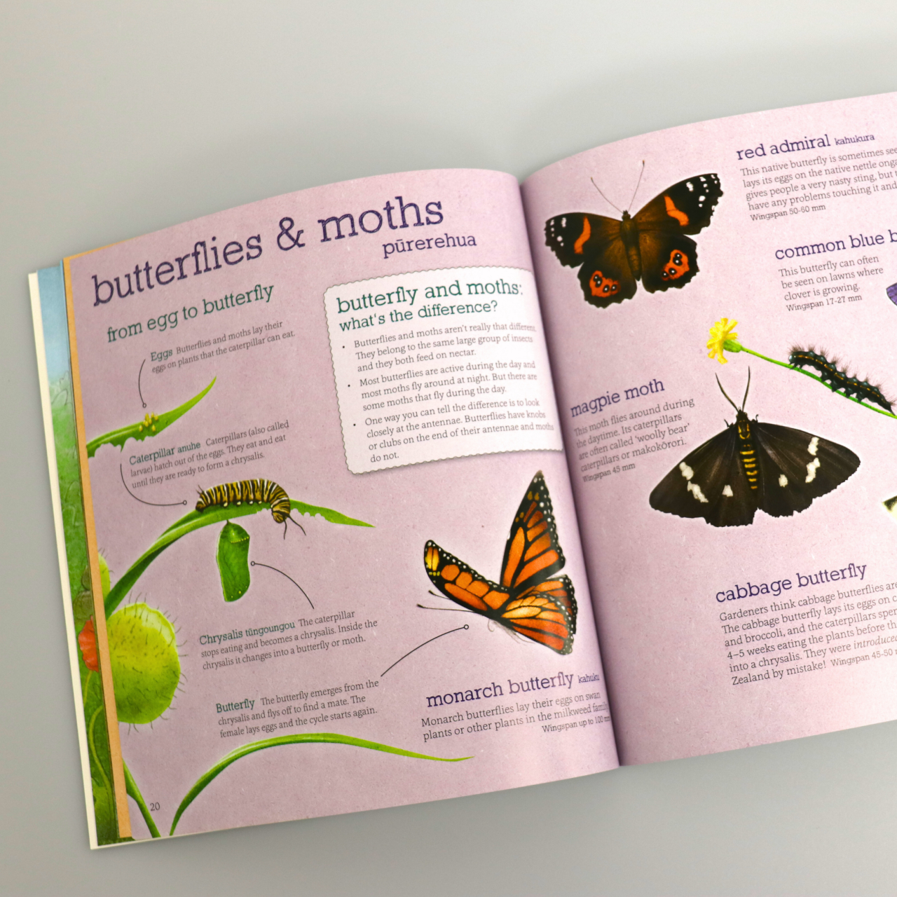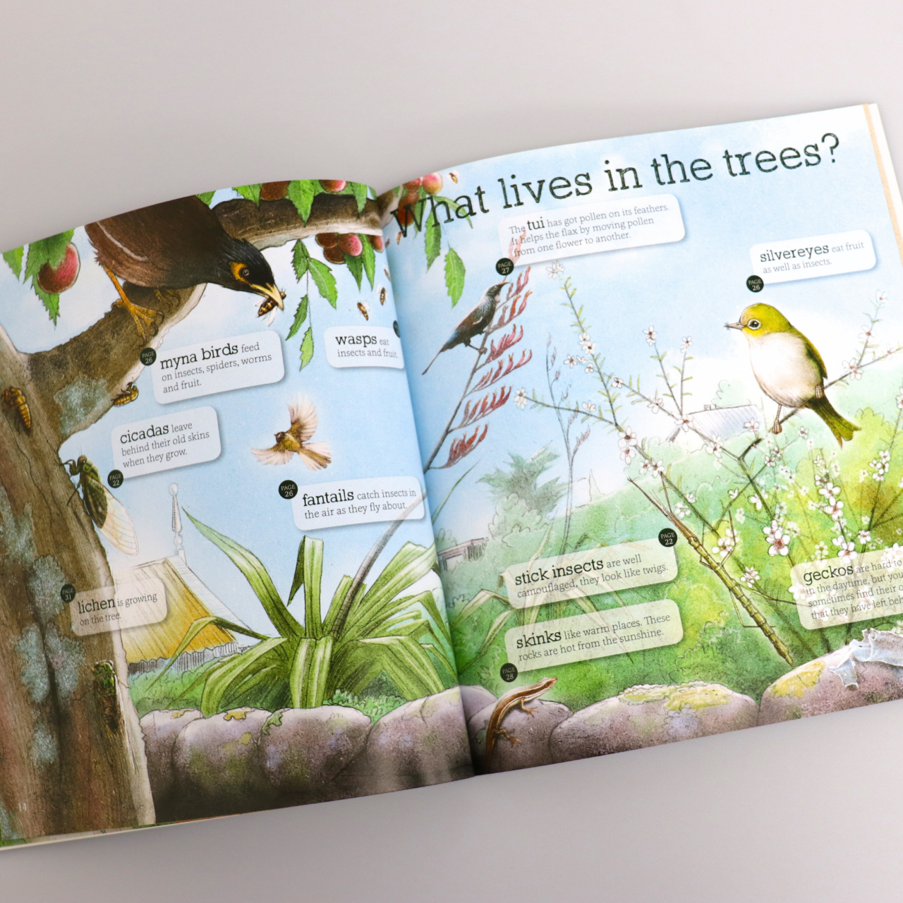 In the Garden: Explore & Discover the New Zealand Backyard invites young learners to explore the world right outside their door. From busy bees and fluttering butterflies to shy geckos and backyard birds, the book introduces children aged 4-8 to the plants and animals they’ll find in a New Zealand garden.