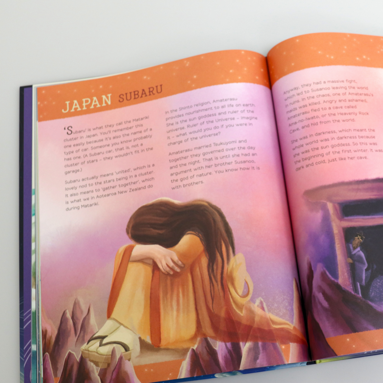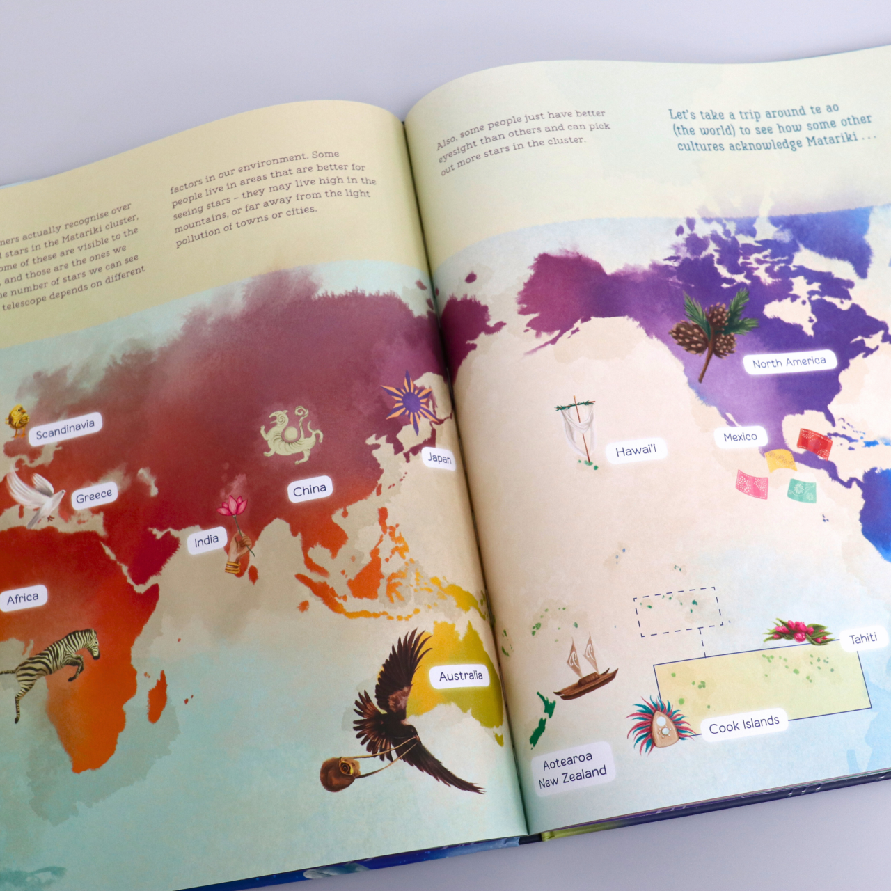 Matariki Around the World: A Cluster of Stars, A Cluster of Stories explores the star cluster known as Matariki (or the Pleiades) through the lenses of multiple cultures. Beginning with the Māori creation story and the maramataka (lunar calendar), the book then travels across the globe from the Pacific Islands to Australia, Asia, and the Americas, to share the varied names, stories, and traditions tied to those same stars.
