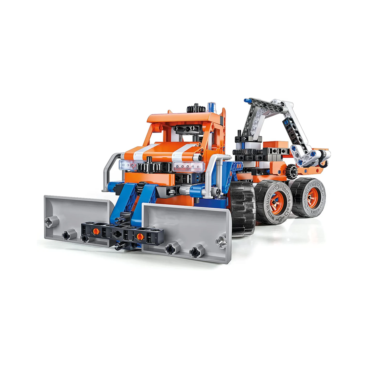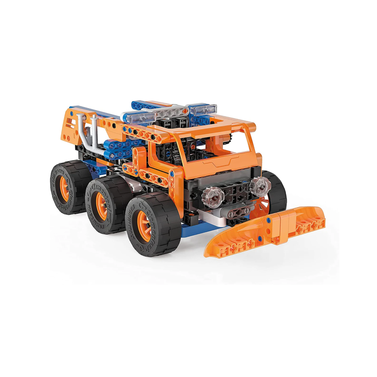 Kids assemble working models that illustrate real mechanical principles, like how a rack-and-pinion mechanism steers or how a blade clears snow, building hands-on understanding of machines.