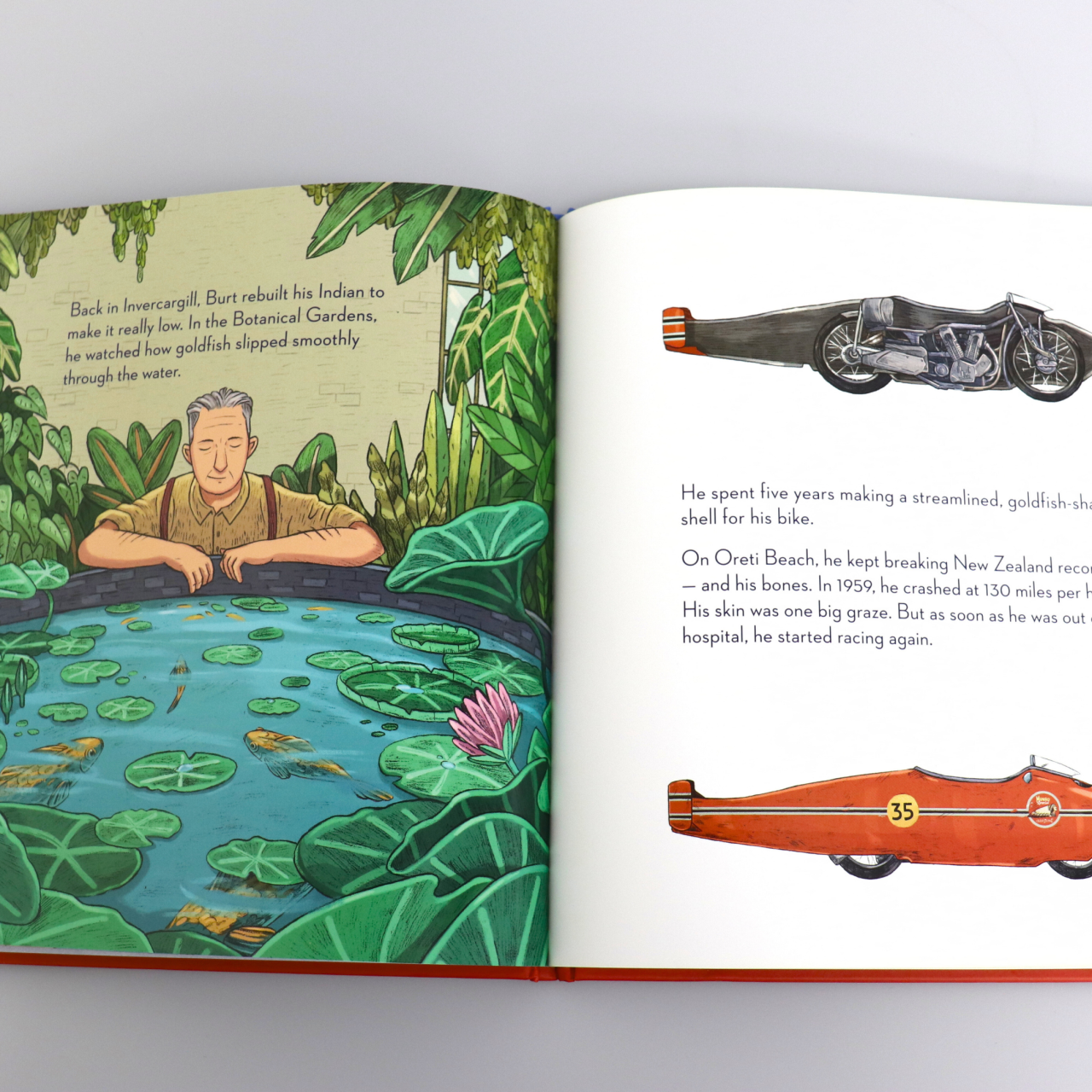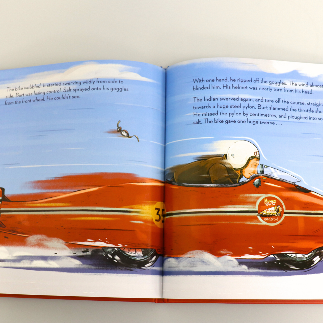 Speed King tells the true and inspiring story of Burt Munro, a Kiwi who didn’t let age, budget, or odds stop him from chasing a land-speed record on a motorcycle he tinkered with himself. From quiet Invercargill streets to the vast salt flats of Bonneville, the book captures his passion, ingenuity, and sheer determination.
