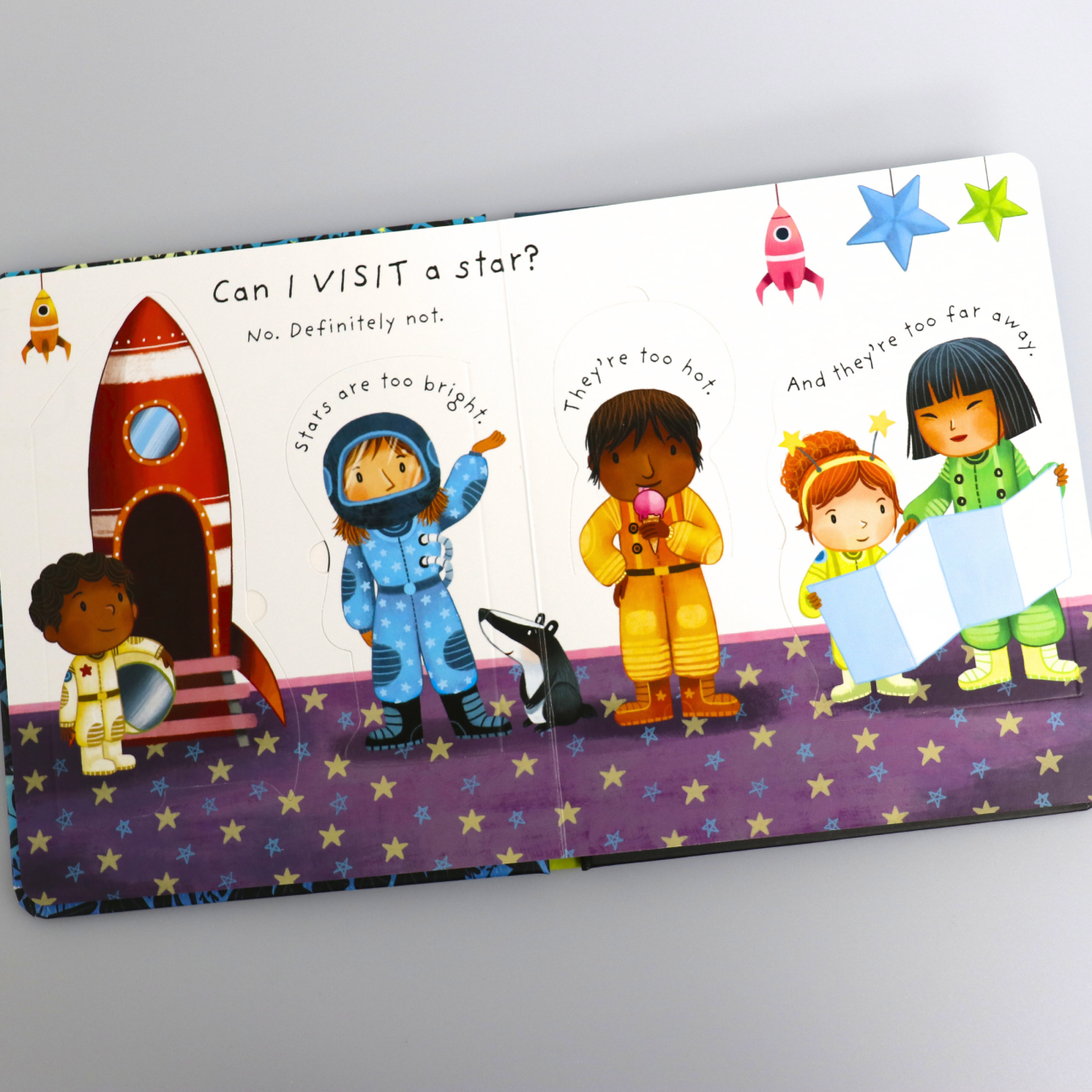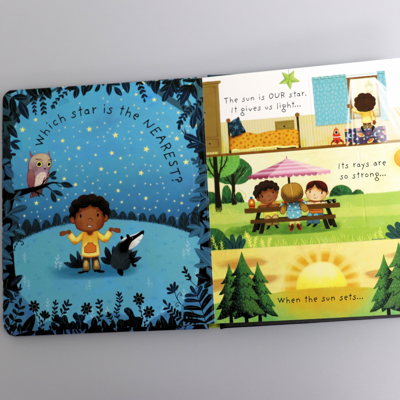 Each page features flaps children can lift to reveal bite-sized facts, making the experience hands-on and joyful. This book helps little ones begin to grasp astronomy in a gentle, playful way.